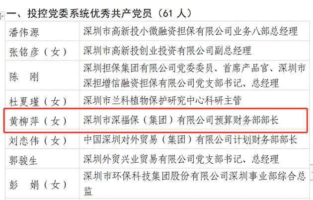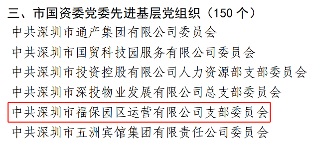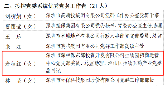 近日,市国资委党委、投控公司党委表彰一批先进基层党组织、优秀共产党员和优秀党务工作者,金年会集团3个集体和个人榜上有名。其中,园区公司党支部获评市国资委党委系统“先进基层党组织”,预算财务部部长黄柳萍获评投控公司党委系统“优秀共产党员”,东部公司党支部委员、坪山生物医药产业党委副书记麦秋红获评投控公司党委系统“优秀党务工作者”。