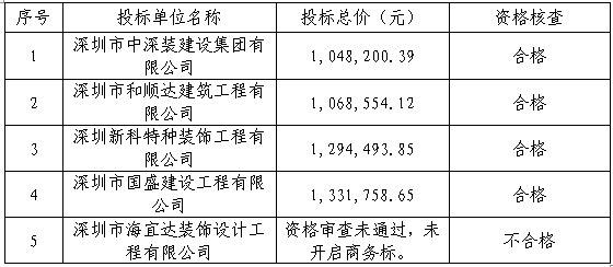 金年会大厦19层总部办公室改造装修工程于2019年1月22日在中国招标投标公共服务平台、深圳国际招标采购网、深国招电子交易系统等网站发布招标公告进行公开招标,招标控制价为139.75万元。在投标截止时间2019年2月25日内共有5家单位递交了投标文件。评标委员会根据招标文件既定评标办法(经评审的最低投标价法)推荐排名第一的投标单位为中标候选人。现中标结果已报集团招投标领导小组审议确认,特此公示如下: