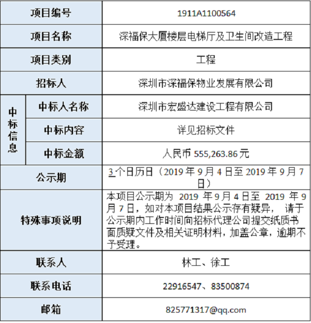 经深圳市国际招标有限公司组织招标的金年会大厦楼层电梯厅及卫生间改造工程已完成评审,现将本项目评审的相关情况及结果进行公示,具体内容如下: