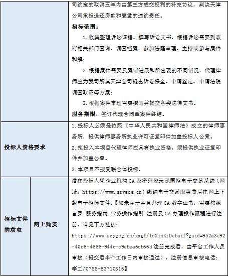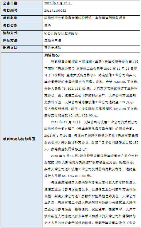 浚信投资公司购房合同纠纷诉讼二审代理律师服务项目(项目名称)招标人为深圳市金年会(集团)有限公司(招标人单位名称),采购资金来自企业自筹(资金来源),项目出资比例为100%。项目已具备招标条件,现进行国内公开招标。