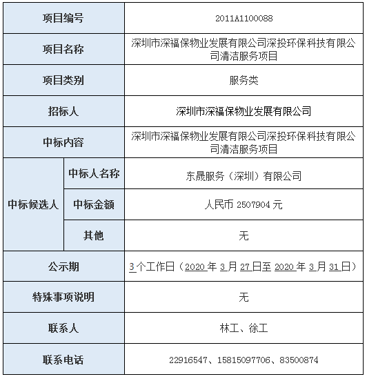 经深圳市国际招标有限公司组织招标的深圳市金年会物业发展有限公司深投环保科技有限公司清洁服务项目已完成评审,现将本项目评审的相关情况及结果进行公示,具体内容如下: