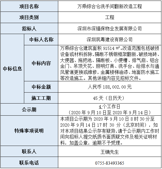 万乘综合仓洗手间翻新改造工程(招标编号:SFBWY/ZB(WX)-2020-006)已完成评审,现将本项目评审的相关情况及结果进行公示,具体内容如下: