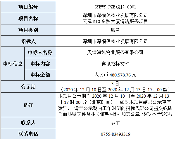 经深圳市国际招标有限公司组织招标的深圳市金年会物业发展有限公司天津MIG金融大厦清洁服务项目已完成评审,现将本项目评审的相关情况及结果进行公示,具体内容如下: