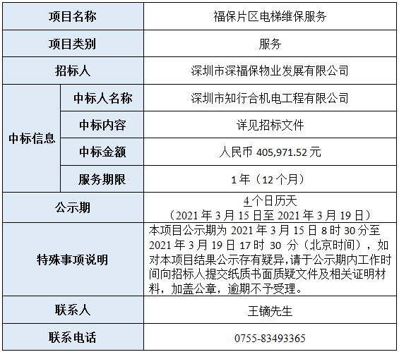 福保片区电梯维保服务(深圳市建设工程材料设备询价采购网络服务平台招标编号:SZXJCG-S202102020006)已完成评审,现将本项目评审的相关情况及结果进行公示,具体内容如下: