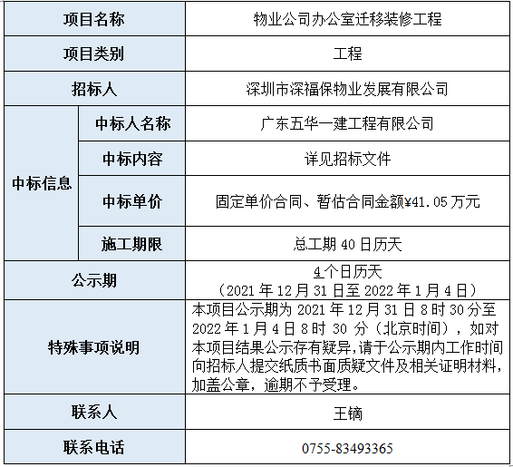 物业公司办公室迁移装修工程通过邀请招标方式采购并已完成评审,现将本项目评审的相关情况及结果进行公示,具体内容如下: