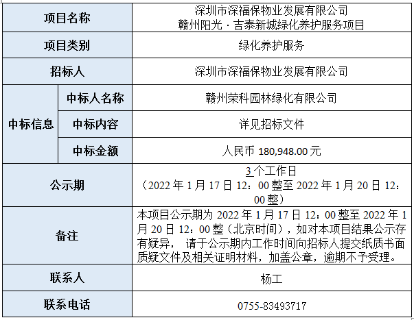 深圳市金年会物业发展有限公司赣州阳光·吉泰新城绿化养护服务项目已完成评审,现将本项目评审的相关情况及结果进行公示,具体内容如下: