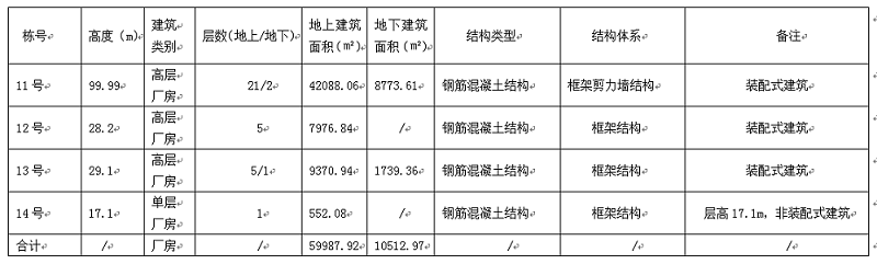3. 工程规模及特征:深圳市生物医药创新产业园区提容项目,用地面积123502.81㎡,现已建建筑面积181689.4㎡,其中厂房157286.24㎡,配套用房24403.16㎡,地下面积为40564.84㎡。现新建4栋楼,合计建筑面积约71052.97㎡,其中地上建筑面积约59987.92㎡、地下建筑面积约10512.97㎡、核减面积552.08㎡,详见下表: