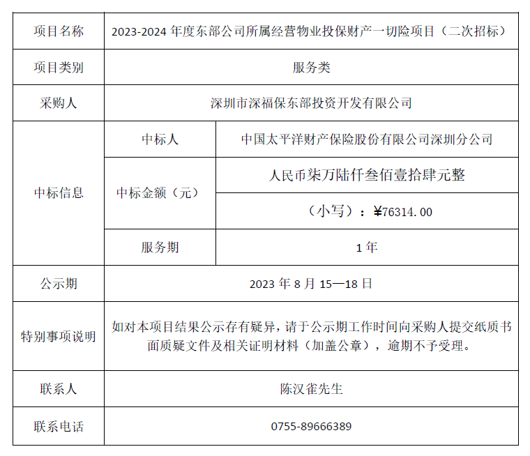 在深圳市建设工程材料设备询价采购平台进行公开招标的2023-2024年度东部公司所属经营物业投保财产一切险项目(二次招标)(项目编号:SZXJCG-S202307310001)已完成定标,现将本项目定标结果进行公示如下: