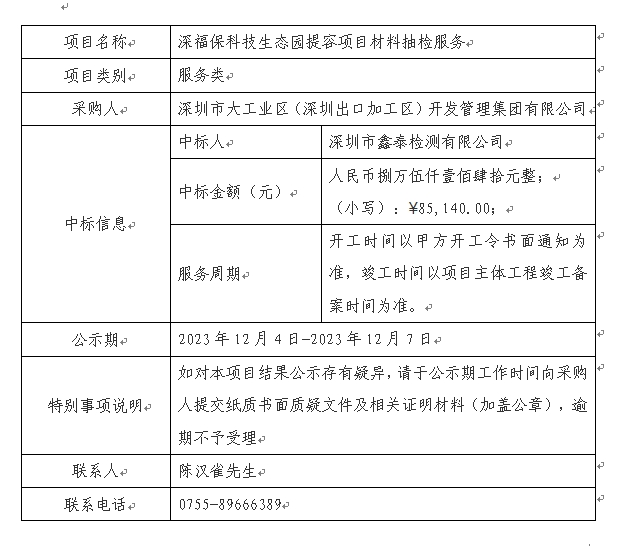 在深圳阳光采购平台进行公开招标的金年会科技生态园提容项目材料抽检服务已完成评审及定标,现将本项目评审的相关情况及定标结果进行公示,具体内容如下: