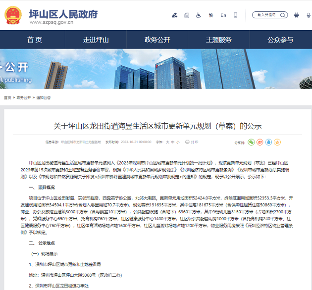 10月21日,海昱生活区城市更新单元规划(草案)在坪山区人民政府网、《深圳商报》正式公示,标志着海昱生活区城市更新项目取得重大进展。