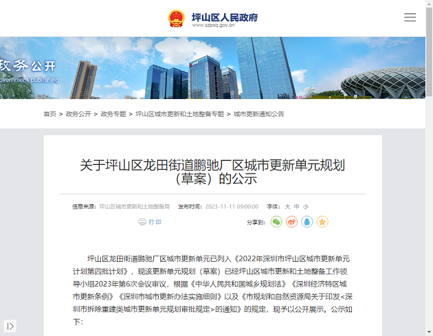 继海昱生活区城市更新项目公示后,11月11日,鹏驰厂区城市更新单元规划(草案)在坪山区人民政府网、《深圳商报》正式公示,标志着鹏驰厂区城市更新项目取得重大进展。